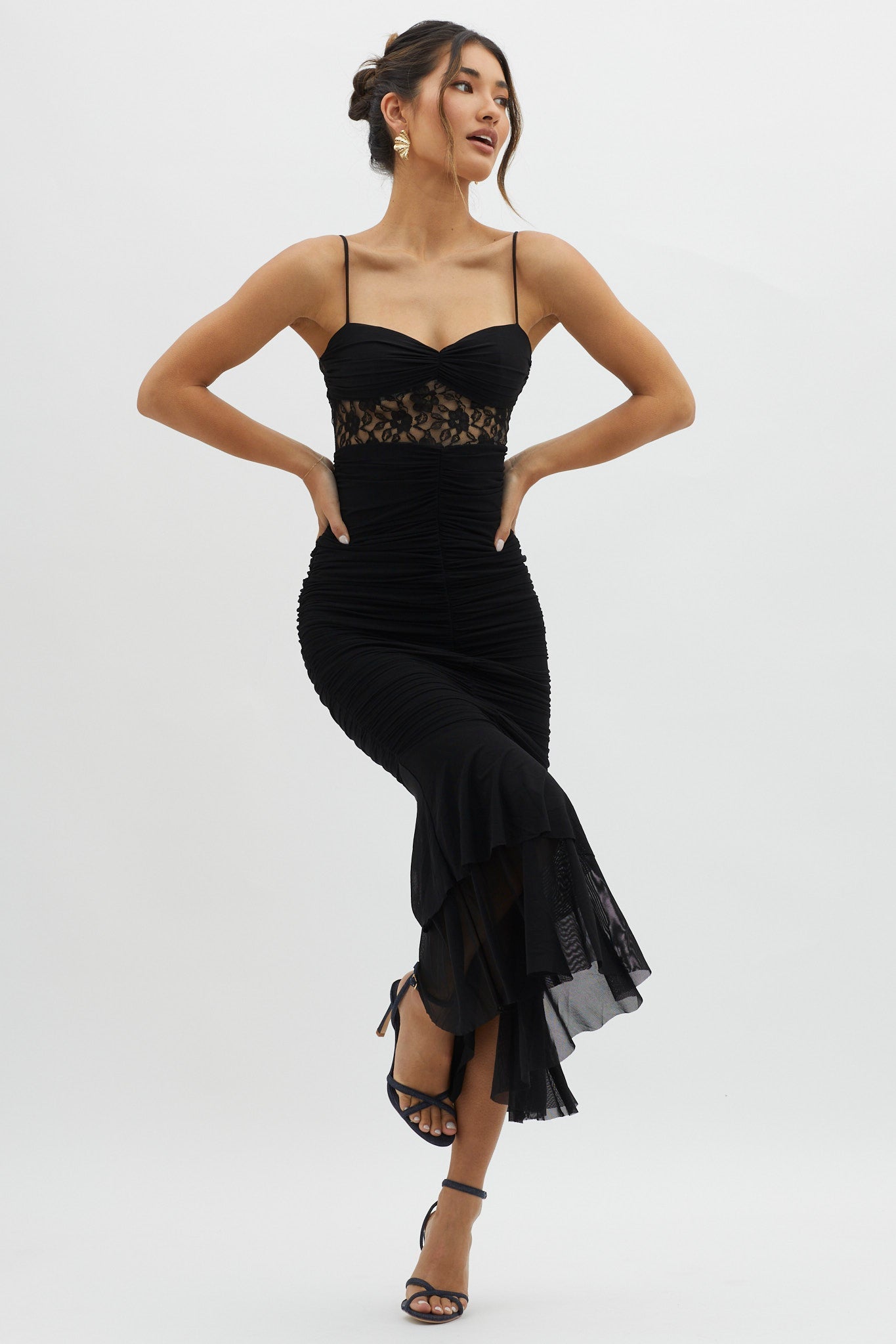 Steal the show in our gorgeous Cherubim midi dress. We are obsessed with its ruching detail throughout and lace bust. Perfect for a wedding or special occasion. Team it with strappy, black heels and a clutch for a look that will turn heads.